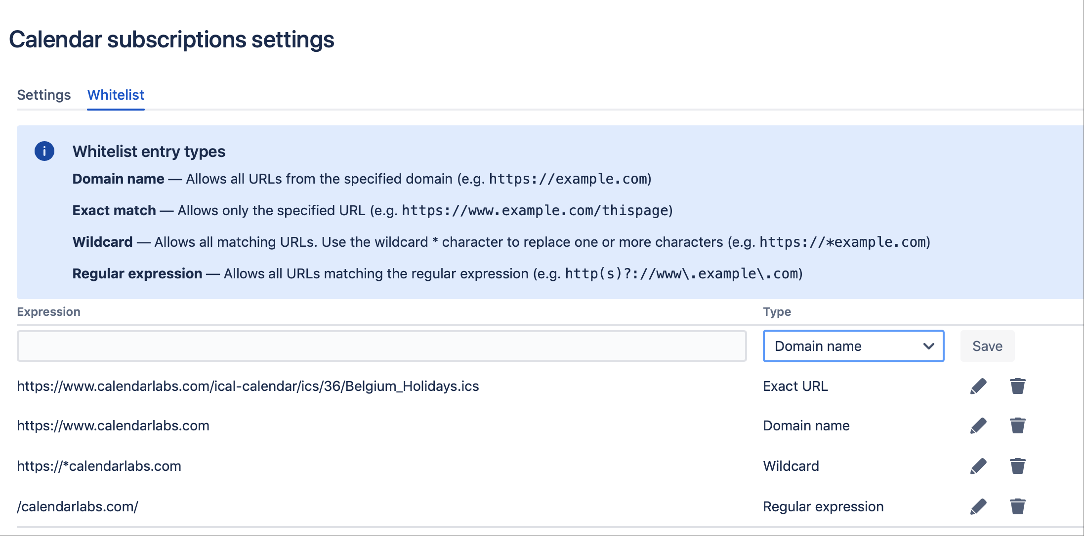 Whitelisting is necessary in order to allow your users to subscribe to calendars of only certain Domains/Url, this allows you to clearly limit subscription only web-resources trusted by you.