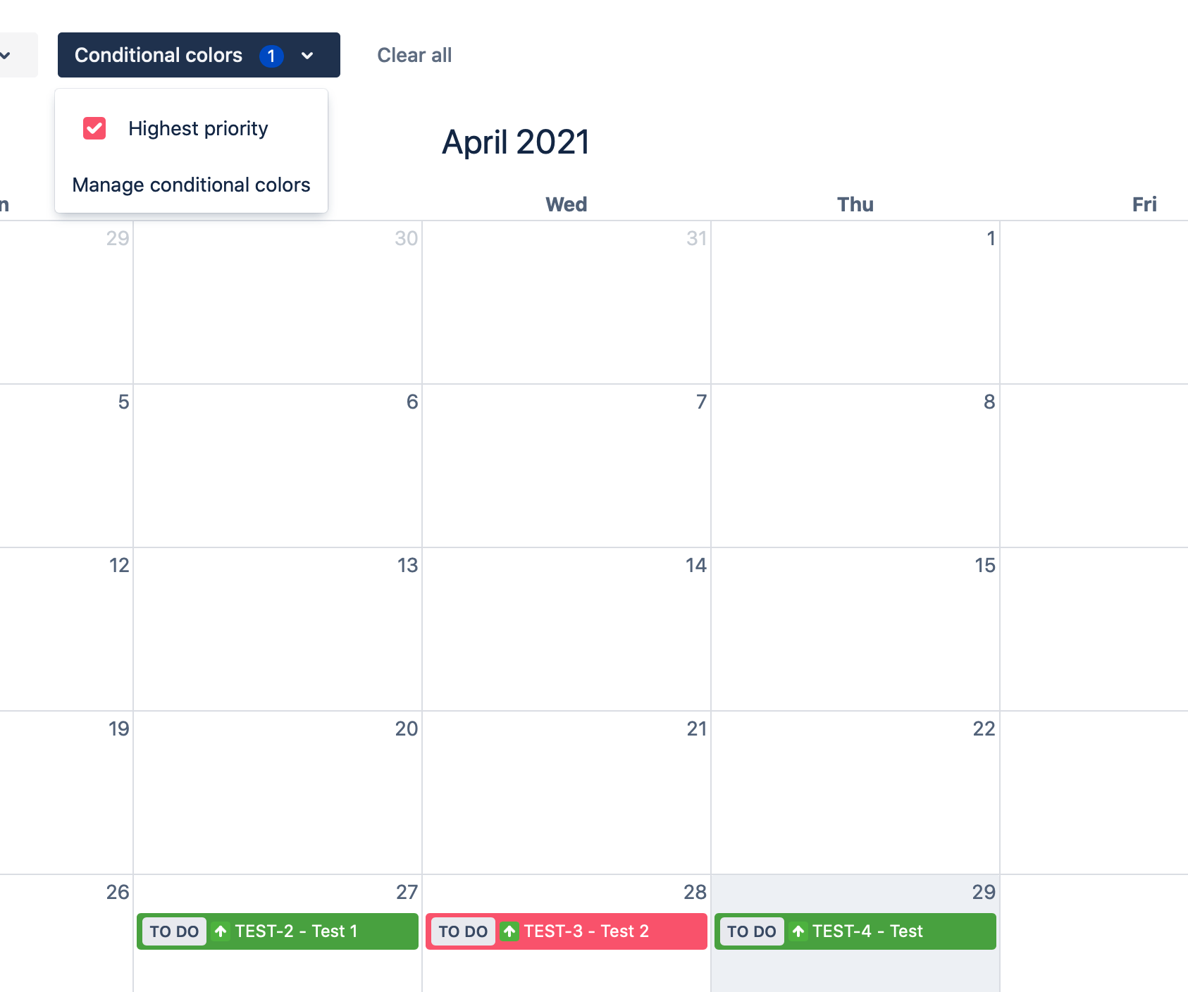 Why not JQL expression? In most cases, a sloppy expression would slice data very, very slowly on the calendar. The color configurator is clear and simple, and we will constantly expand it upon the request of our clients.