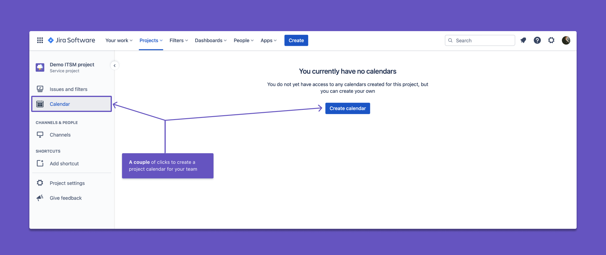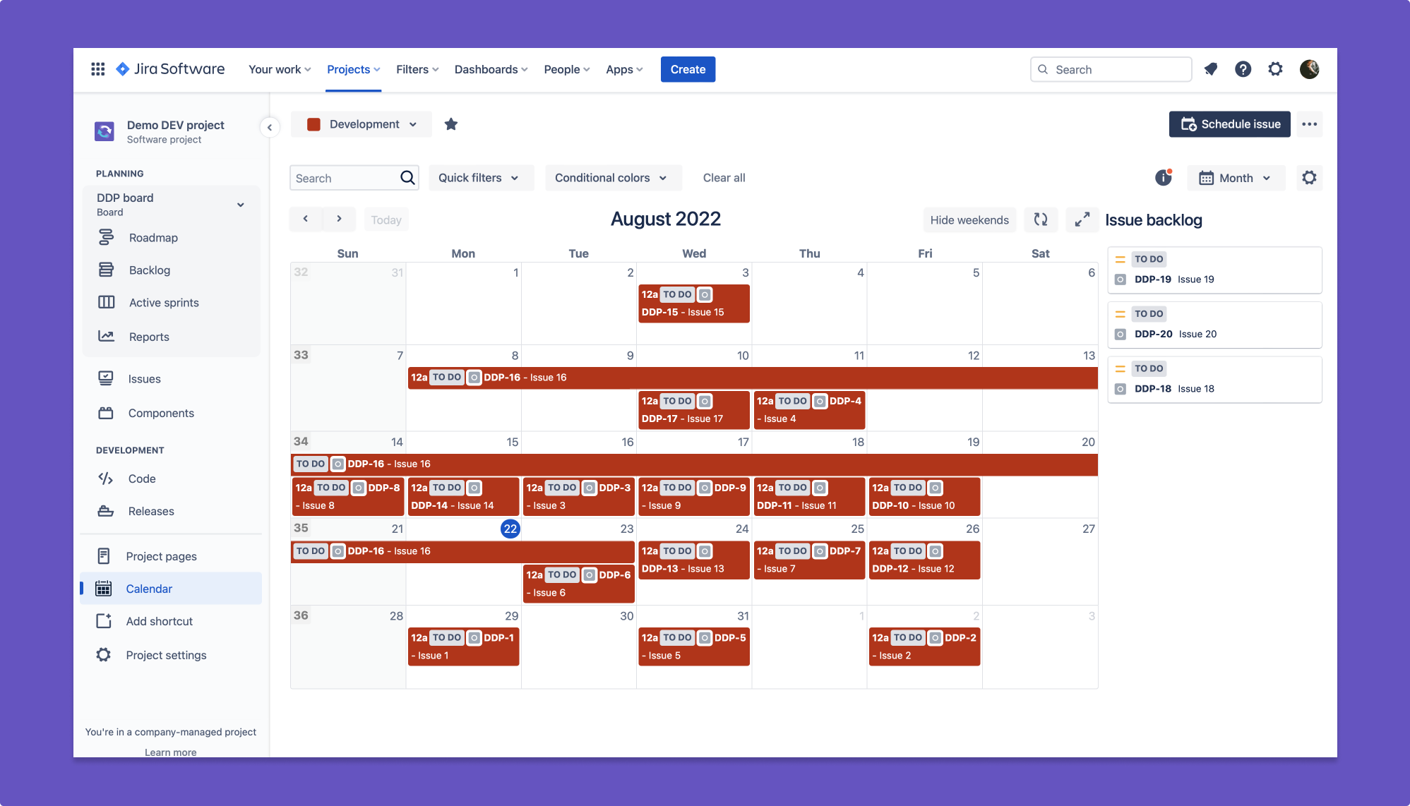 Your calendar is ready to go. You can track the progress of your issues, releases, schedule meetings and any other project activities.