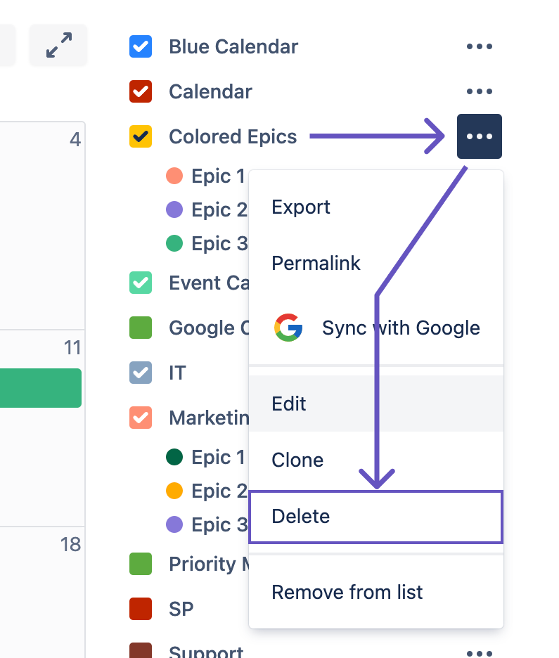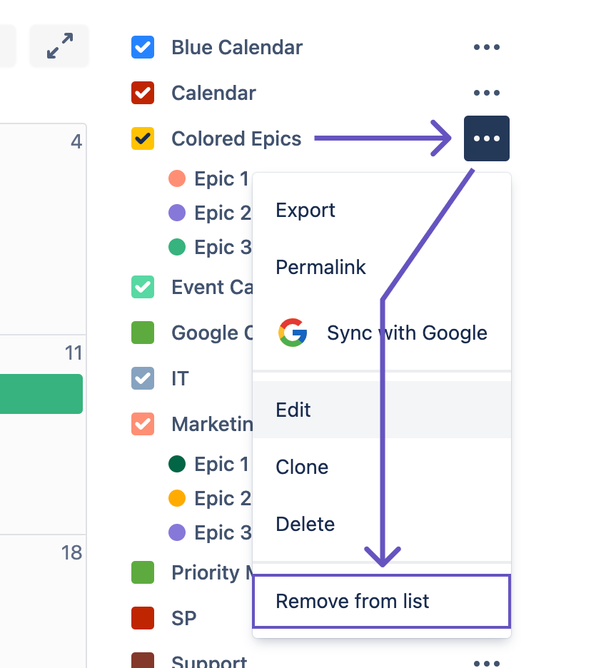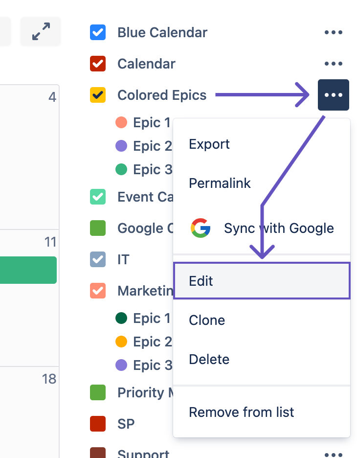 First, select the required calendar in the list of calendars on the right side and click on the three dots.