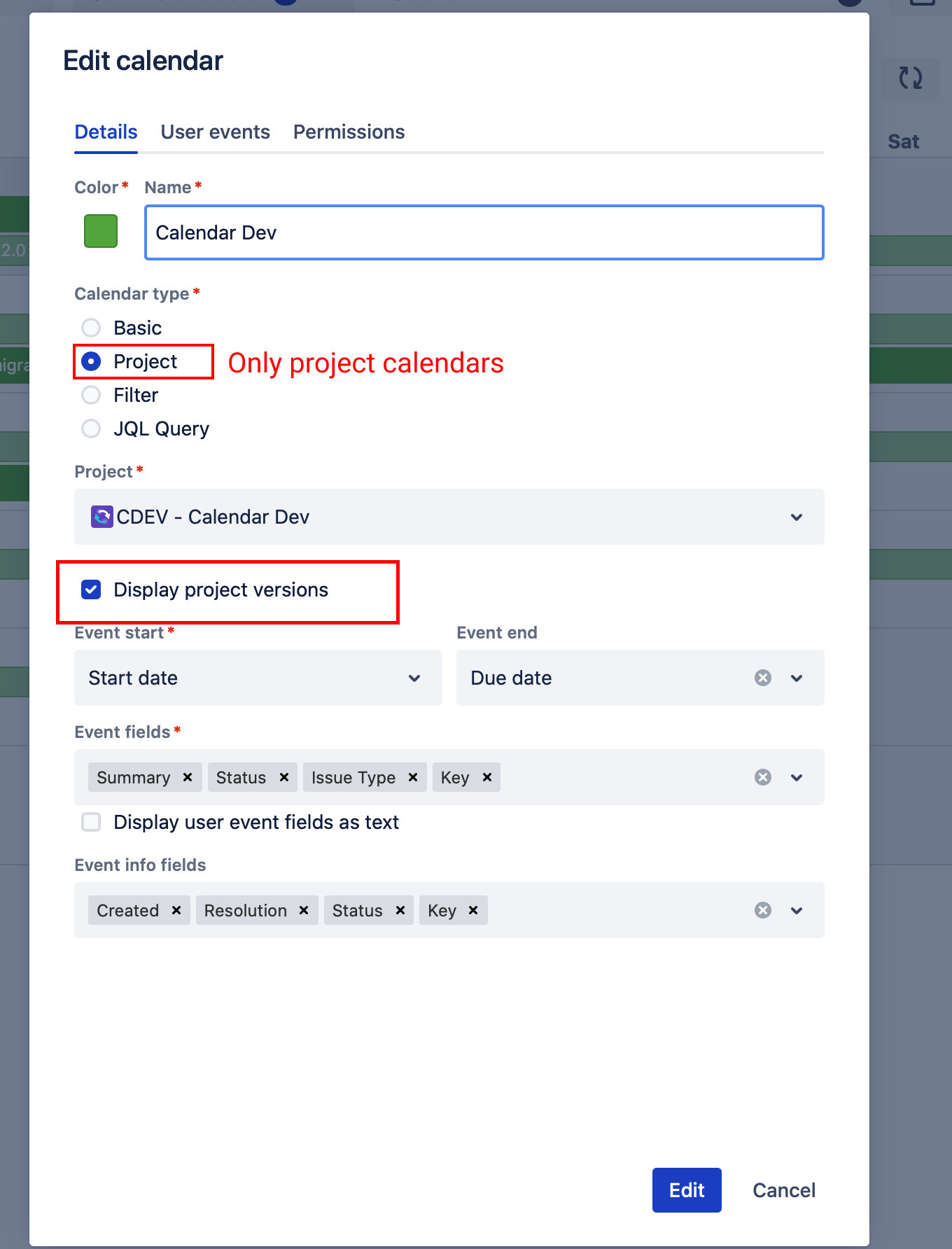 Jira versions can be displayed on the calendar to keep information on releases in front of your eyes and compare it with real issues and their statuses.
