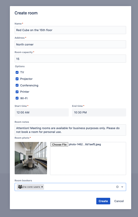 let's create the first meeting room. Users with create permission of location can create rooms.