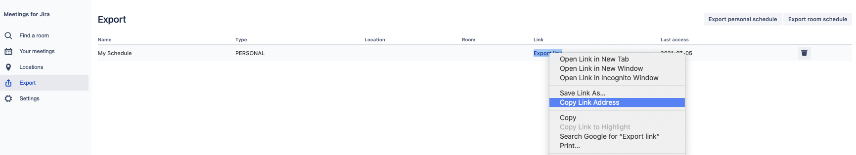Press “Export personal schedule" to export a personal schedule or “Export room schedule" to export events for a meeting room you have access to.